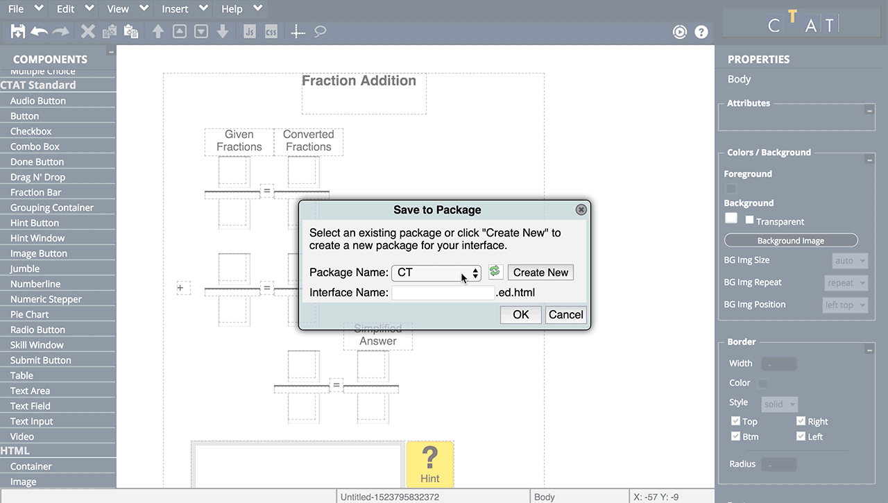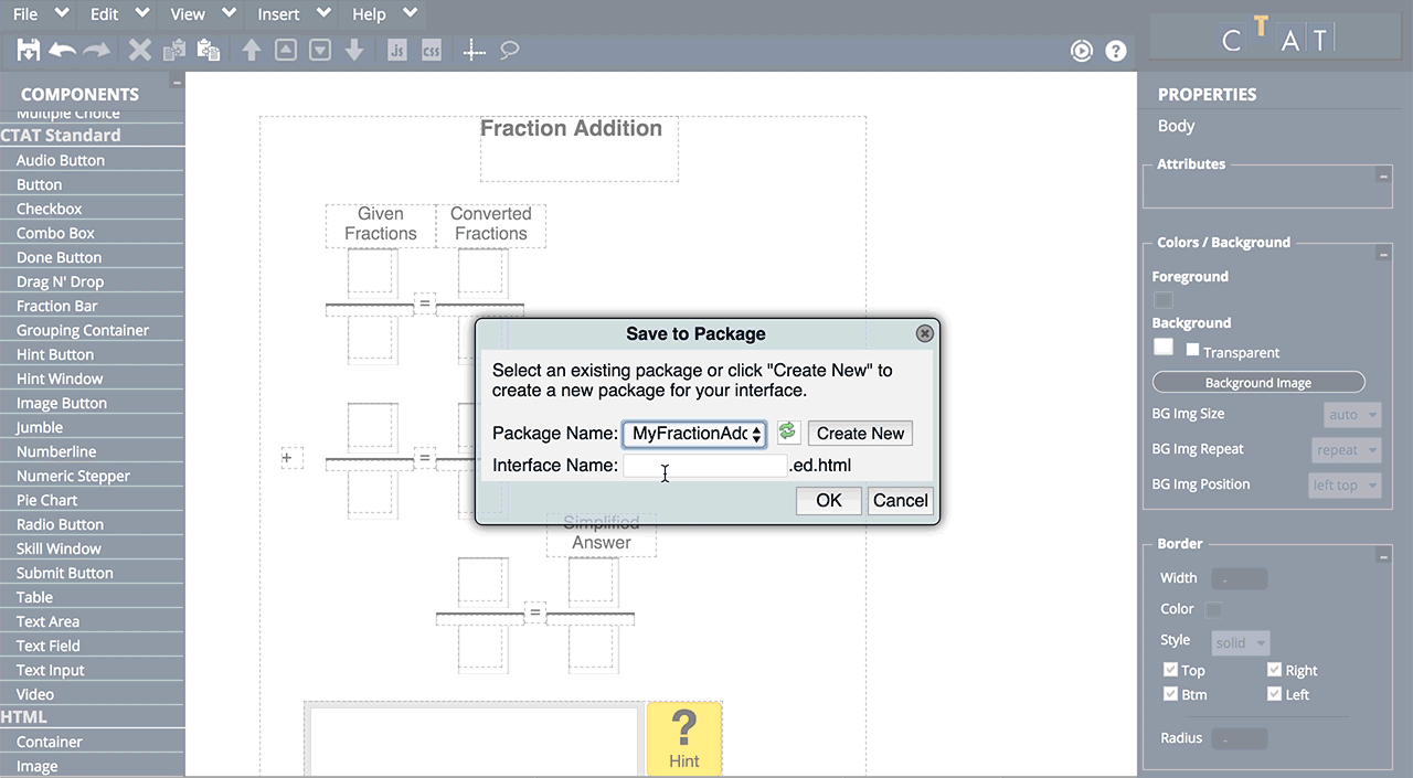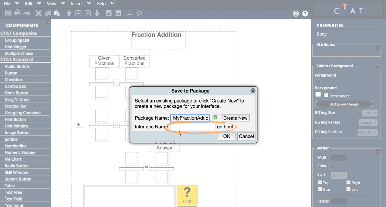 Finally, assign a name to your interface. CTAT will save a .html and an .ed.html file in your package folder.